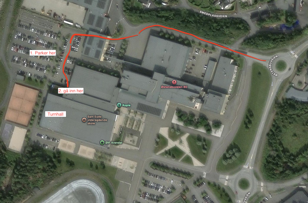 Parker eller gå bak Sam Eyde videregående skole, og benytt inngangen mellom lysløypa/utendørs tennis og bygget.